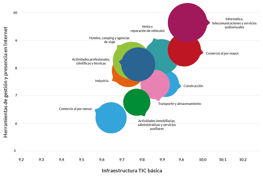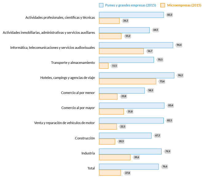 Las microempresas son las que tienen más margen de mejora, pues en 2015 todavía había un 24% de empresas que no utilizaban la telefonía móvil para sus comunicaciones. En el caso de pymes y grandes empresas, ya son muy pocas las compañías que no disponen de conexión a la red, pues en 2015 ya la habían incorporado el 98.4% de empresas de 10 o más empleados.